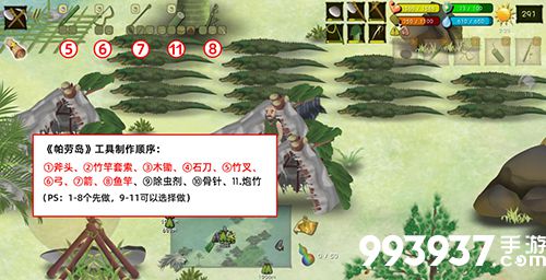 开局制作工具的先后顺序:①斧头、②竹竿套索、③木锄、④石刀、⑤竹叉、⑥弓、⑦箭、⑧鱼竿、⑨除虫剂、⑩骨针、11炮竹。