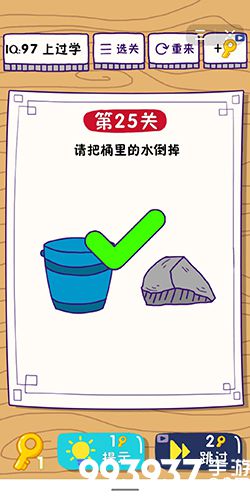 在第25关中,想把桶里的水倒掉,该怎么办呢?难道要借助旁边的石头?下面小编就给玩家带来这题太难了第25关怎么过的攻略,一起去看看吧!