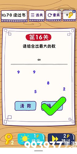 在第16关中,下面有一些数字,你怎么才能组合出最大的数字呢?下面小编就给玩家带来这题太难了第16关怎么过的攻略,一起去看看吧!