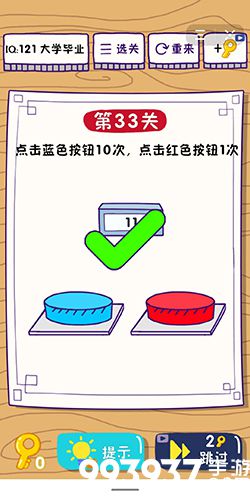 在第33关中,你需要点击蓝色按钮10次,点击红色按钮1次。下面小编就给玩家带来这题太难了第33关怎么过的攻略,一起去看看吧!