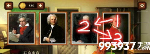 开启声音,根据听到的歌曲,点击对应的人物。完成后,开门过关。