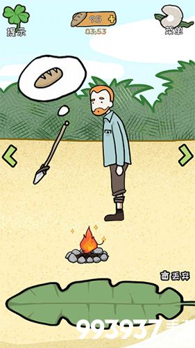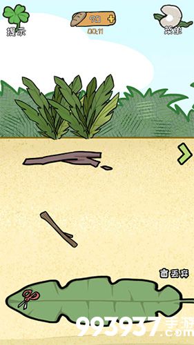 1.拾取界面右面沙滩的剪刀,剪界面左边草丛旁边的破旧衣服(几个布条组成)得到一个布条;