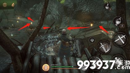 四、前进至断桥处,经过2个蜥蜴后,来到悬挂小怪的洞口。
