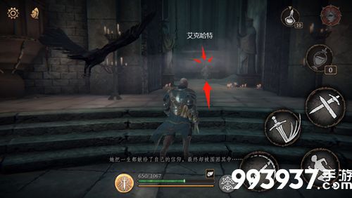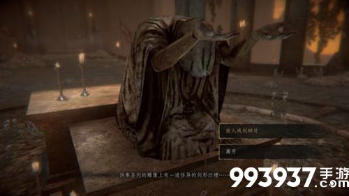 二、在艾克哈特旁边,乘坐升降梯往上,到圣剑雕像处可以获得【崔斯坦的慈悲】,并出现4个弓箭手,此时到手的是假圣剑。按雕像正对的方向看去,过桥后即是第一个四神柱,附近有1个骑士和2个弓箭手。开门后,即可获得圣剑碎片【灰暗的剑格】和【狂人日记】。(第一个圣剑碎片到手)