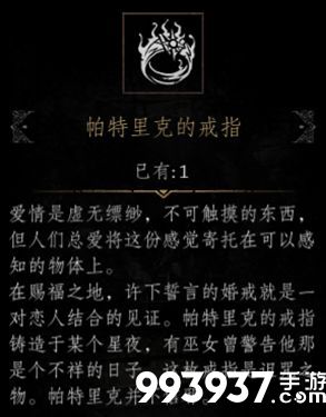 任务报酬:帕特里克的戒指(重要材料,此章节最有价值的战利品-誓言的合成素材之一)