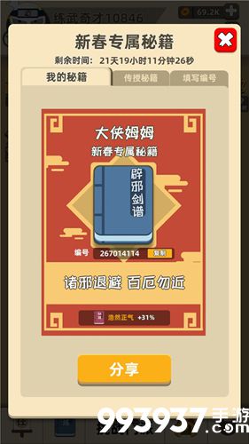此次新春游戏中特别加入了一本秘籍,带又编号的辟邪剑谱,看起来十分强力,这个秘籍肯定就不能错过了,是带有时间限制的,来看看我功夫特牛春节秘籍怎么刷吧。......